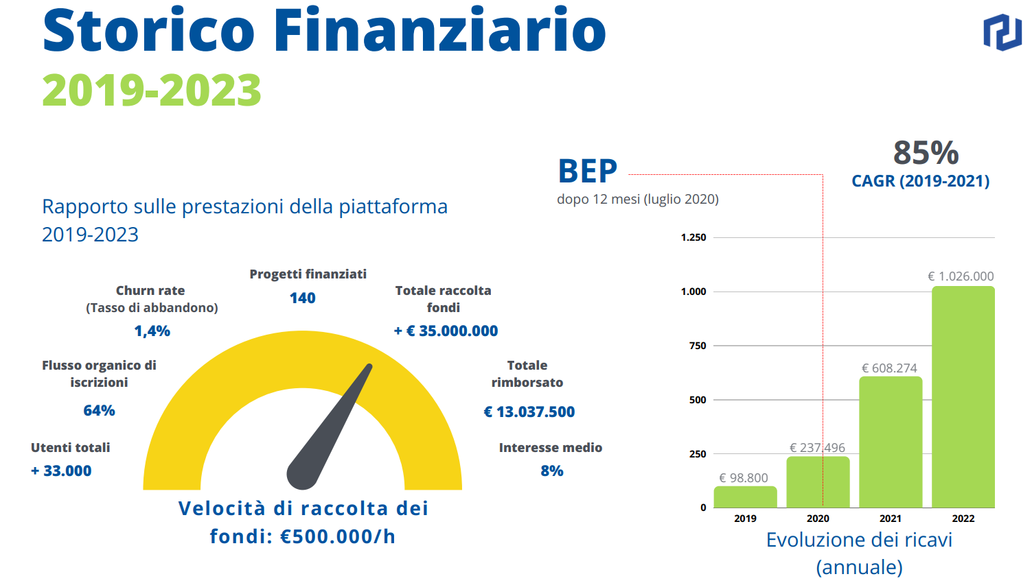 Dal 2019 ad oggi la piattaforma ha raccolto oltre € 35 milioni da oltre 33.000 utenti registrati,finanziando più di 35 società. Dopo 12 mesi dalla sua nascita, la società ha inoltre raggiunto il break-even point (punto di pareggio), chiudendo il 2020 con un EBITDA e flusso di cassa positivo, con un CAGR (Tasso annuo di crescita composto) 2019-2021 dell’85%.